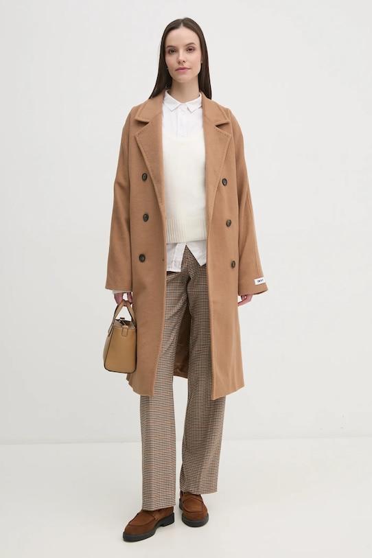 Это пальто из коллекции Dkny без подкладки выполнено из гладкого материала. Высокое содержание шерсти обеспечивает защиту от холода, а добавление полиэстера повышает устойчивость к сминанию. - Свободный крой, обеспечивающий полную свободу движений. - Двубортный пиджак с застежкой на пуговицы. - Неутепленная модель с подкладкой. - Текстильный ремешок в комплекте. - Два боковых накладных кармана. - Длина рукава (от воротника): 75 см. - Длина: 108 см. - Ширина под мышками: 57 см. - Размеры указаны для размера: M.