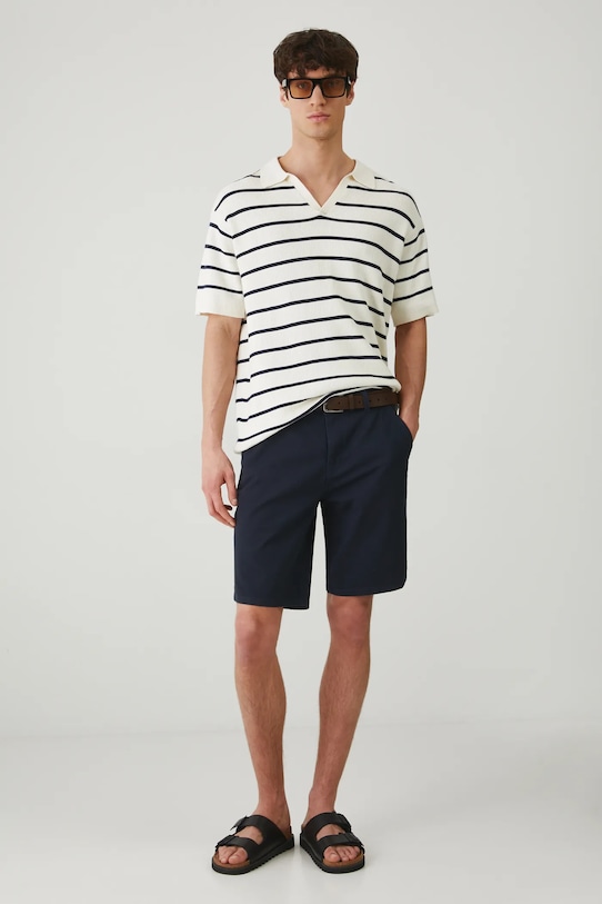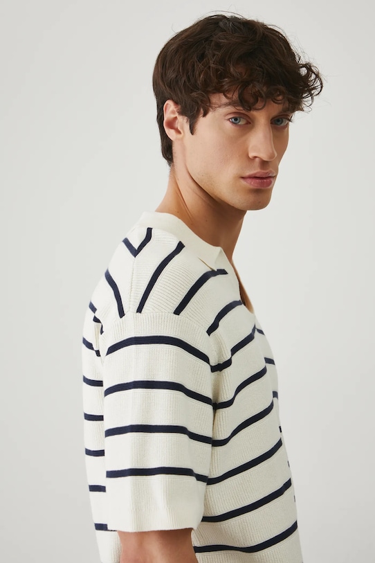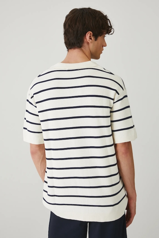 Рубашка-поло из коллекции Medicine. Изготовлена из фактурного трикотажа. - Материал с сертификатом OEKO-TEX Standard 100 гарантирует, что текстильные изделия, на которых он нанесен, не содержат вредных и потенциально опасных для человека и окружающей среды веществ. - Свободный покрой. - Короткий рукав. - Заниженная линия плеча. - Модель с воротником. - Материал с текстурой. - Узорчатое трикотажное полотно. - Полосатый рисунок. - Длина: 74 см. - Ширина груди: 58 см. - Размеры указаны для размера: L.