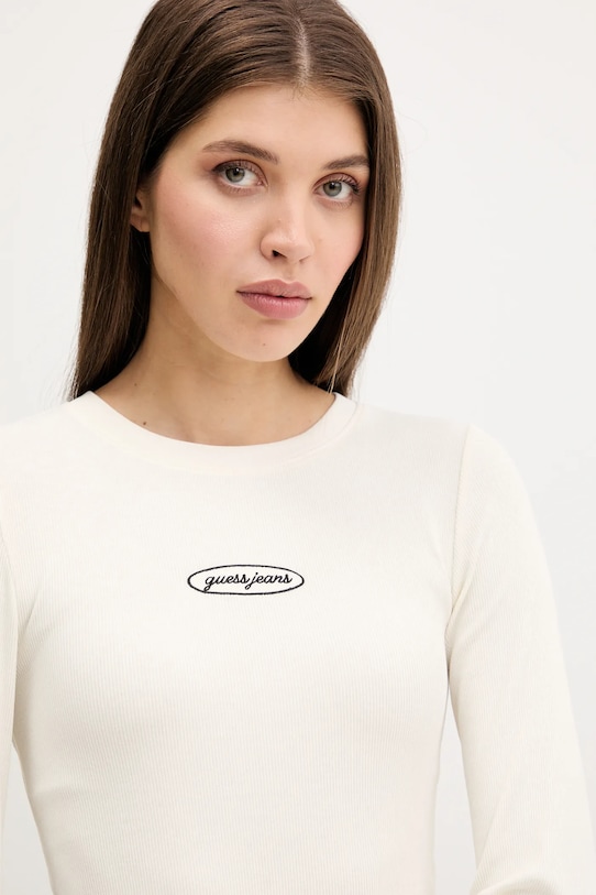 Этот лонгслив из коллекции Guess Jeans выполнен из трикотажного полотна в рубчик. Оптимальная эластичность обеспечивает полную свободу движений. - Продукция Guess Eco разработана таким образом, чтобы производить как можно меньше отходов без ущерба для качества и долговечности. - Приталенный крой, подчеркивающий силуэт. - Длинный рукав. - Классический круглый вырез. - Модель с декоративной аппликацией. - Длина рукава: 62 см. - Длина: 53 см. - Ширина под мышками: 35 см. - Размеры указаны для размера: S.