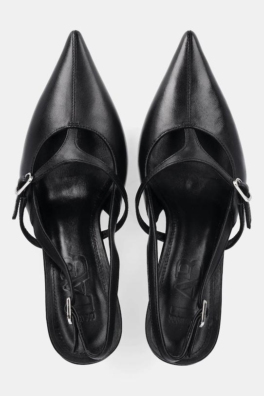 Эти туфли Answear.LAB изготовлены из натуральной кожи. Они оснащены кожаной стелькой, которая благодаря естественным порам предотвращает натирание, истирание и появление неприятного запаха. - Заостренный, жесткий нос. - Модель с открытой пяткой. - Резиновая подошва прочная и устойчивая к повреждениям. - В комплект модели входит дополнительная пара каблуков. - Застежка на две пряжки со штифтом для индивидуальной посадки. - Высота каблука: 7 см. - Длина вставки: 24,5 см. - Размеры указаны для размера: 38.