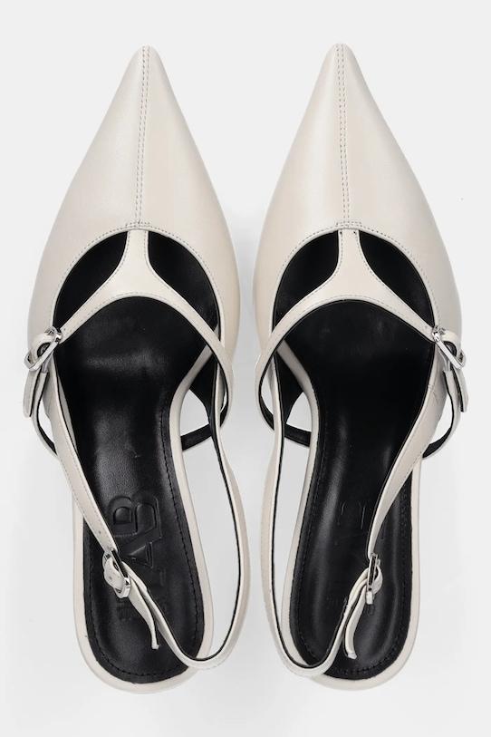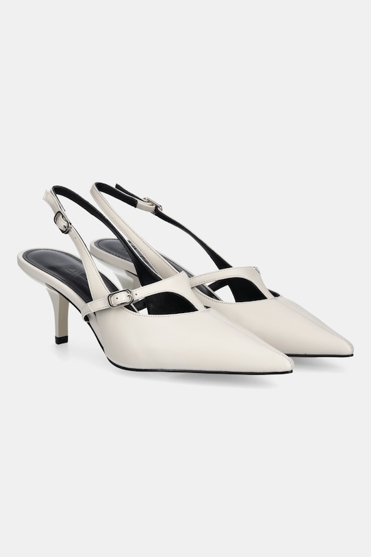 Эти туфли Answear.LAB изготовлены из натуральной кожи. Они оснащены кожаной стелькой, которая благодаря естественным порам предотвращает натирание, истирание и появление неприятного запаха. - Заостренный, жесткий нос. - Модель с открытой пяткой. - Резиновая подошва прочная и устойчивая к повреждениям. - В комплект модели входит дополнительная пара каблуков. - Застежка на две пряжки со штифтом для индивидуальной посадки. - Высота каблука: 7 см. - Длина вставки: 24,5 см. - Размеры указаны для размера: 38.