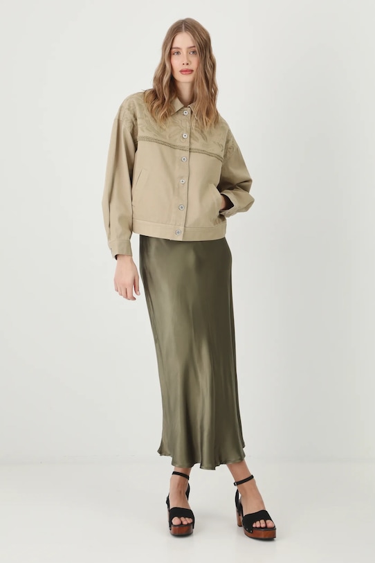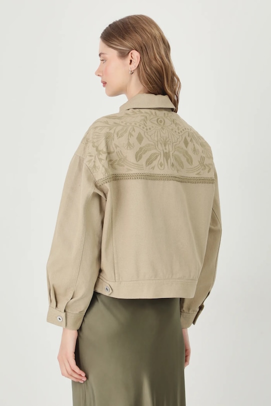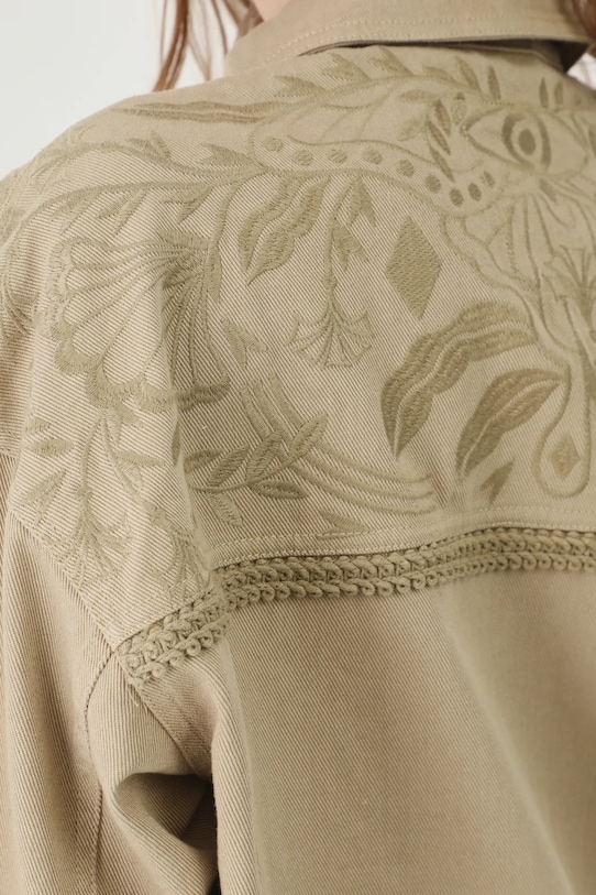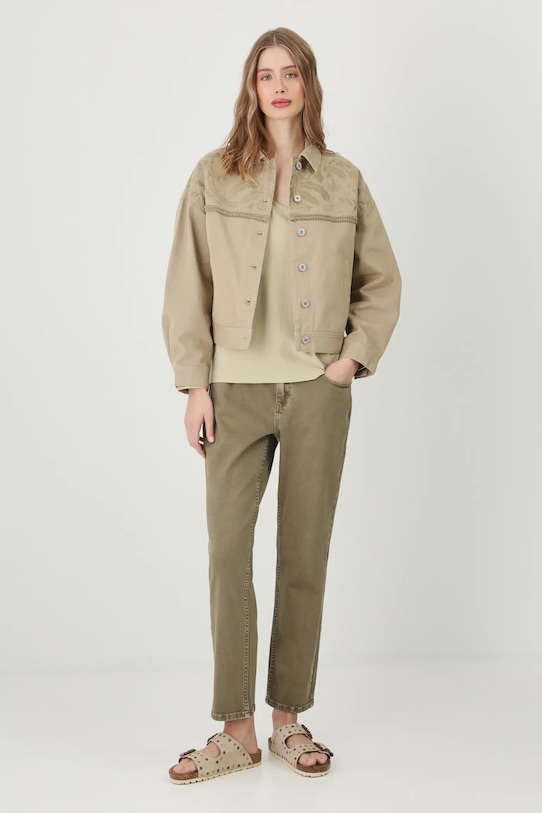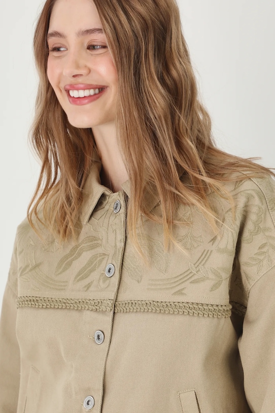Куртка из коллекции Medicine. Модель без подкладки выполнена из хлопкового денима. - Большой размер. - Длинный рукав. - Заниженная линия плеча. - Рукава с манжетами на пуговицах. - Модель с воротником. - Застежка на пуговицы. - Два боковых накладных кармана. - Модель с декоративной вышивкой. - Регулировка ширины талии с помощью кнопок. - Неутепленная модель без подкладки. - Длина рукава (от воротника): 72,5 см. - Длина: 58 см. - Ширина груди: 61 см. - Размеры указаны для размера: S.