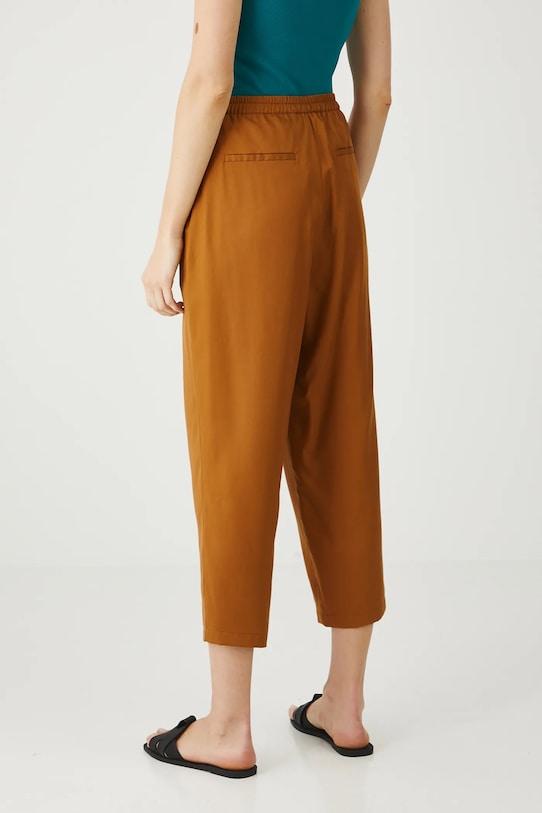 Брюки из коллекции «Медицина». Изготовлены из гладкой ткани. - Мешковатый стиль. - Обхват талии обычный. - Эластичный пояс со шнурками. - Накладные карманы. - Декоративные закладки. - Гладкая ткань. - Укороченная нога. - Модель изготовлена из лиоцелла. - Ширина талии (до растягивания): 36,5 см. - Ширина талии (после растяжения): 42 см. - Ширина бедер: 52 см. - Высота талии: 34 см. - Ширина штанины внизу: 20 см. - Длина по внутреннему шву: 63 см. - Размеры указаны для размера: S.