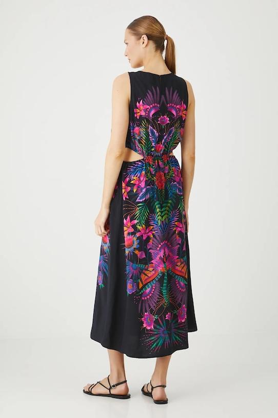 Платье из коллекции «Медицина». Расклешенный фасон из узорчатой ткани. - Расклешенный крой. - Модель без рукавов. - Вырез горловины «лодочка». - Застежка-молния. - Декоративные разрезы по бокам. - Эластичный пояс. - Узорчатая ткань. - Узор с растительными и животными мотивами. - Модель длины миди. - Ширина талии (до растягивания): 33,5 см. - Ширина талии (после растяжения): 47 см. - Ширина бедер: 57 см. - Ширина груди: 47,5 см. - Длина: 128 см. - Размеры указаны для размера: S.
