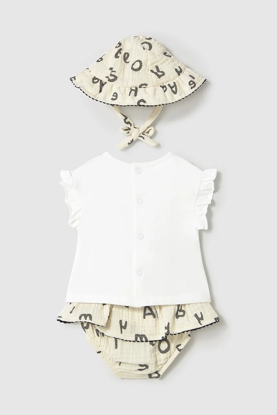 Этот комплект для новорождённых из коллекции Mayoral Newborn выполнен из комбинированных материалов с различными узорами. В комплект входит шапочка. – Инициатива «Лучший хлопок». Изделия с этой маркировкой содержат не менее 50% хлопка от розничного продавца или бренда, участвующего в инициативе «Лучший хлопок» и инвестирующего в развитие BCI. - Простой дизайн. - Застегивается на кнопку сзади. - Классический круглый вырез. - Модель с декоративными оборками. - Эластичный пояс со шнурками. - Узорчатый материал.