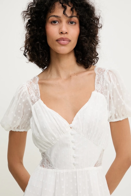 Это платье из коллекции Answear.LAB выполнено из ткани с рисунком. Полиэстер обеспечивает высокую устойчивость к сминанию. - Расклешенный крой. - Дополнительный слой материала в виде подкладки. - Декоративный, заостренный вырез. - Короткие, пышные рукава. - Рукава отделаны узкой эластичной манжетой. - Застежка на короткие пуговицы обеспечивает эффективную вентиляцию и легкость надевания и снимания. - Потайная застежка-молния сзади. - Модель с декоративными оборками. - Тонкая, неэластичная ткань.