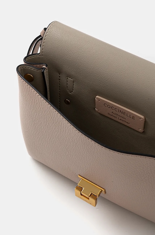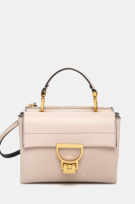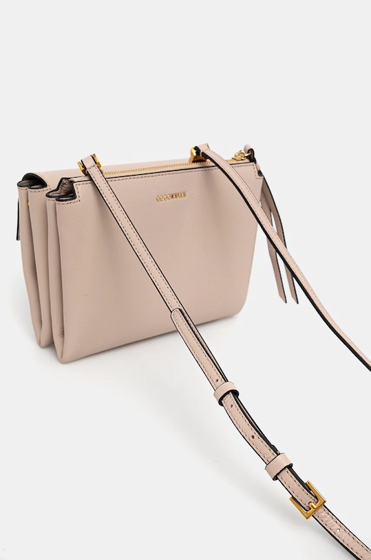 Небольшая сумочка из коллекции Coccinelle. Модель на молнии, выполнена из натуральной кожи. - Двухкамерная модель. - Застежка-молния и кнопки. - Регулировка глубины с помощью защелок. - Внутренних карманов нет. - Модель без подкладки. - Не подходит для формата А4. - Имеет съемную ручку и съемный регулируемый ремень. - Сумка для ношения в руке или на плече. - Входящий в комплект тканевый чехол защищает изделие от пыли. - Глубина: 7 см. - Высота: 14,5 см. - Ширина у основания: 20 см.