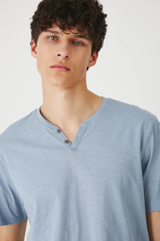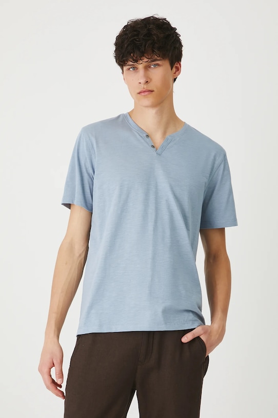 Футболка из коллекции «Медицина». Изготовлена из гладкого трикотажного полотна. - Материал с сертификатом OEKO-TEX Standard 100 гарантирует, что текстильные изделия, на которых он нанесен, не содержат вредных и потенциально опасных для человека и окружающей среды веществ. - Обычная посадка. - Короткий рукав. - Круглый вырез. - Короткая планка с пуговицами. - Трикотажное полотно толстого переплетения с неровной текстурой. - Длина: 72 см. - Ширина груди: 54,2 см. - Размеры указаны для размера: M.