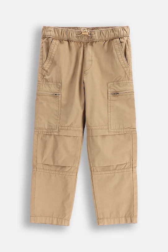 Детские брюки из коллекции Coccodrillo из гладкой ткани. Модель выполнена из исключительно комфортного хлопкового материала. - Продукция с сертификатом ECO 5 выдается продуктам, которые соответствуют ряду высоких требований, связанных с управлением производством. - Регулировка талии с помощью завязок и стопоров, обеспечивающая индивидуальную посадку по фигуре. - Высокая талия с эластичным поясом. - Крой с зауженными брючинами, не стесняющими движений. - Два накладных кармана спереди. - Карманы на молнии.