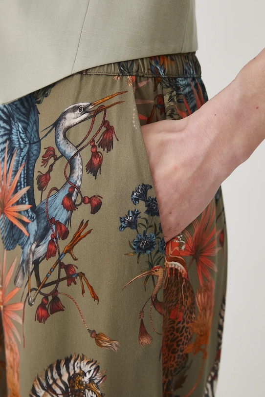 Брюки из коллекции «Медицина». Изготовлены из узорчатой ткани. - Широкий фасон штанины. - Заниженная талия. - Эластичный пояс. - Два боковых накладных кармана. - Широкие штанины. - Узорчатая ткань. - Узор с растительными и животными мотивами. - Ширина талии (до растягивания): 37,5 см. - Ширина талии (после растяжения): 46,5 см. - Ширина бедер: 53 см. - Высота талии: 27 см. - Ширина штанины внизу: 27,5 см. - Длина по внутреннему шву: 80 см. - Размеры указаны для размера: S.