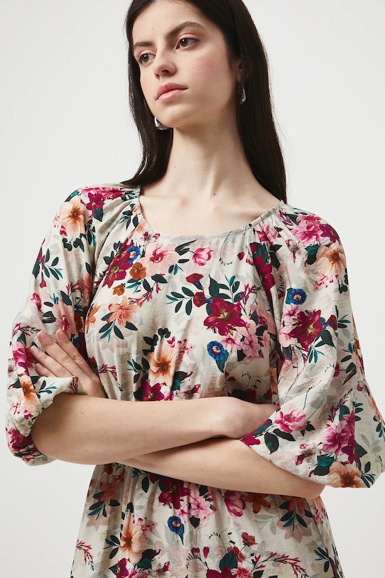 Платье из коллекции «Медицина». Расклешенный фасон из узорчатой ткани. - Расклешенный крой. - Короткие рукава реглан. - Круглый вырез. - Эластичный пояс. - Модель с декоративной оборкой. - Узорчатая ткань. - Цветочный узор. - Модель длины миди. - Ширина талии (до растягивания): 32,5 см. - Ширина талии (после растяжения): 47,5 см. - Ширина груди: 46 см. - Длина: 129 см. - Размеры указаны для размера: S. - Ремешок, показанный на фотографии, в комплект поставки не входит.