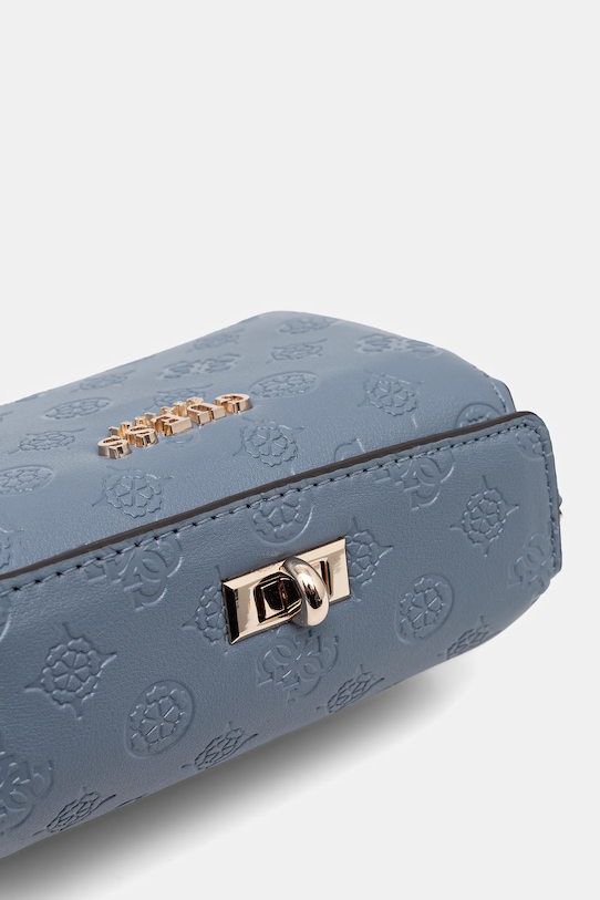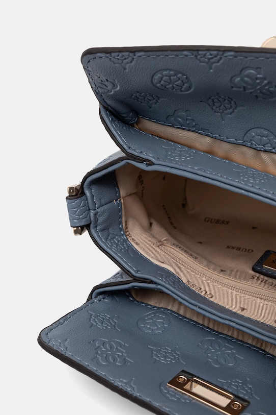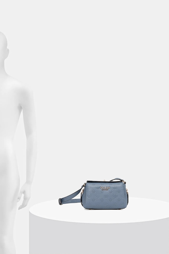 Небольшая сумочка из коллекции Guess. Модель на молнии, выполнена из экокожи. - Поворотная застежка. - Несъемный, регулируемый ремешок. - Не подходит для формата А4. - Модель оснащена металлическими ножками, защищающими дно сумки. - Модель на подкладке. - Имеет три отделения. - Внутренний карман на молнии. - Количество слотов для карт: 3. - Минимальная длина ремешка: 112 см. - Максимальная длина ремня: 130 см. - Глубина: 9 см. - Высота: 13 см. - Ширина у основания: 19 см.