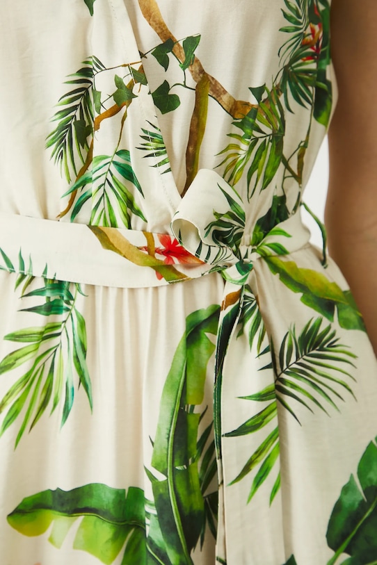 Платье из коллекции «Медицина». Расклешенный фасон из узорчатой ткани. - Расклешенный крой. - Модель без рукавов. - Острый вырез. - Модель с декоративными завязками. - Вырез на спине. - Текстильный ремешок в комплекте. - Эластичный пояс. - Узорчатая ткань. - Узор с растительным мотивом. - Модель длины миди. - Ширина талии (до растягивания): 32 см. - Ширина талии (в растянутом виде): 48,5 см. - Ширина груди: 50,5 см. - Длина: 127,5 см. - Размеры указаны для размера: S.
