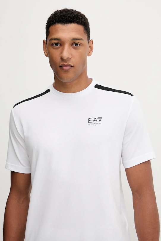 Эта футболка из коллекции EA7 Emporio Armani выполнена из тонкой, эластичной ткани. Эта модель выполнена из исключительно комфортного и дышащего материала, идеально подходящего для теплого времени года. - Технология Ventus7 гарантирует оптимальную регуляцию температуры тела и превосходное отведение влаги. - Простой дизайн, не стесняющий движений. - Короткий рукав. - Классический круглый вырез. - Модель с принтом. - Длина: 71 см. - Ширина под мышками: 55 см. - Размеры указаны для размера: M.