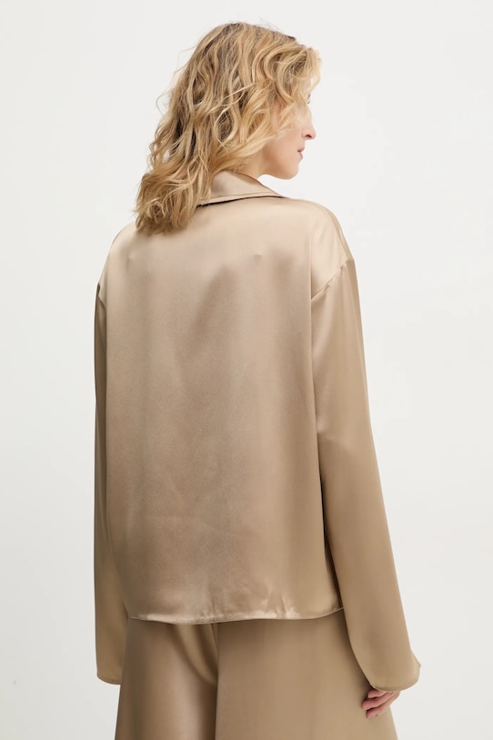 Эта блузка из коллекции Nanushka выполнена из тонкой, неэластичной ткани. Благодаря содержанию полиэстера она менее мнётся. - Свободный крой, обеспечивающий полную свободу движений. - Крой рукава со спущенной линией плеча не стесняет движений. - Модель с воротником. - Короткая застежка-молния обеспечивает эффективную вентиляцию и легкость надевания и снимания. - Модель выполнена из материала атласного переплетения. - Длина: 63 см. - Ширина под мышками: 56,5 см. - Размеры указаны для размера: S.