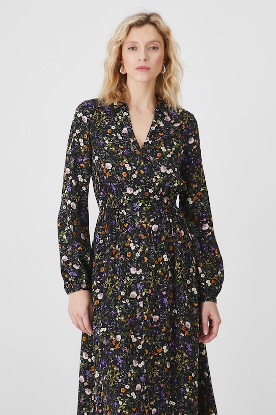 Платье из коллекции «Медицина». Расклешенный фасон из узорчатой ткани.