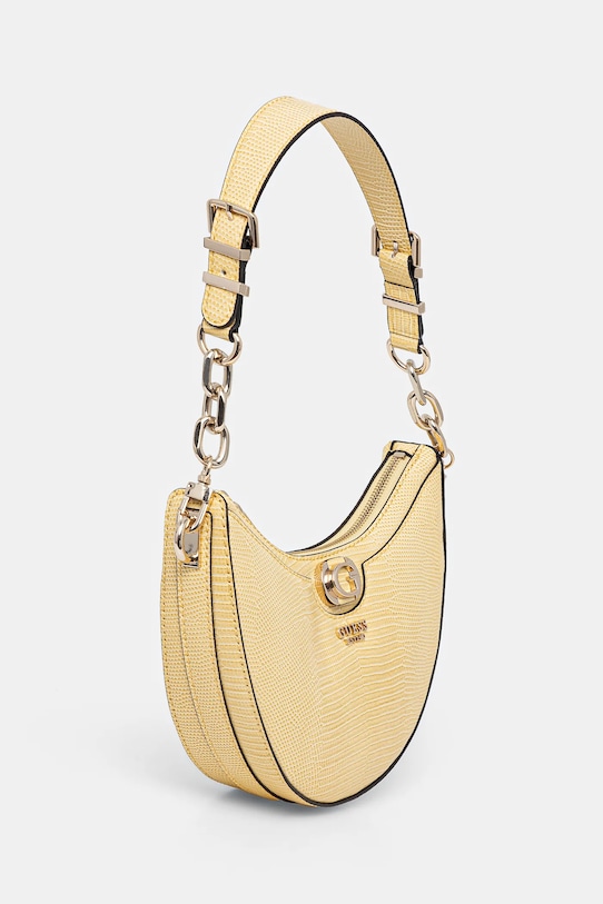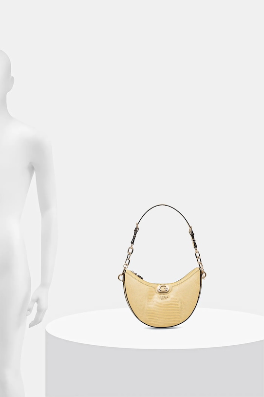 Небольшая сумочка из коллекции Guess. Модель на молнии, выполнена из экокожи. - Застежка-молния. - Модель на подкладке. - Имеет два внутренних кармана: один прорезной, другой на молнии. - Карман на молнии на задней стороне позволяет безопасно хранить телефон или другие мелкие предметы. - Не подходит для формата А4. - Сумка для ношения в руке или на плече. - Входящий в комплект тканевый чехол защищает изделие от пыли. - Глубина: 6 см. - Высота: 15 см. - Ширина у основания: 25,5 см.