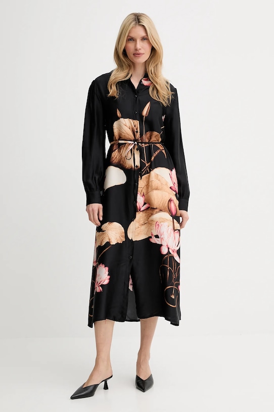 Это платье из коллекции Answear.LAB выполнено из тонкой, неэластичной ткани. Модель выполнена из дышащего вискозного материала. - Расклешенный крой. - Модель без подкладки. - Застежка на пуговицы позволяет легко надевать и снимать. - Пояс на талии корректирует фигуру и еще больше подчеркивает талию. - Модель с воротником. - Длинные, пышные рукава. - Мягкие манжеты с застежкой на пуговицы. - Узорчатая ткань. - Длина: 128 см. - Ширина под мышками: 50 см. - Указаны размеры: S/M.