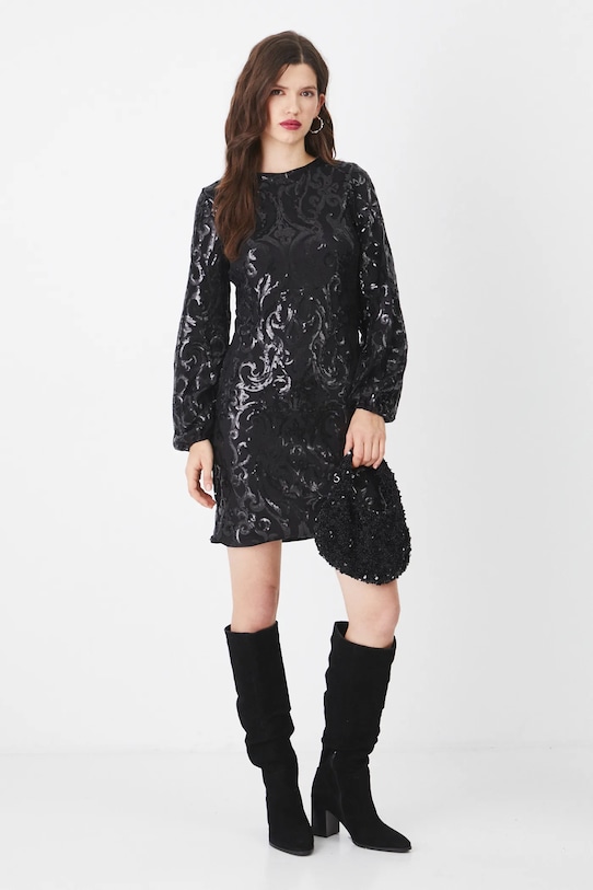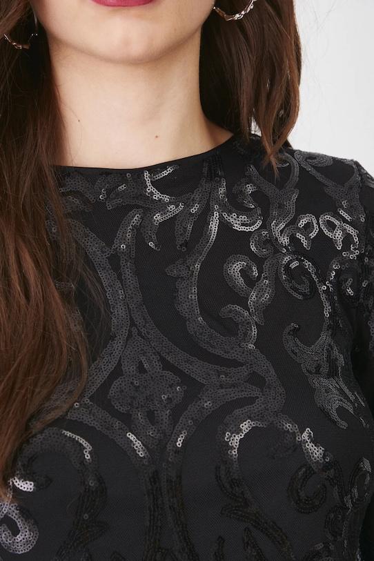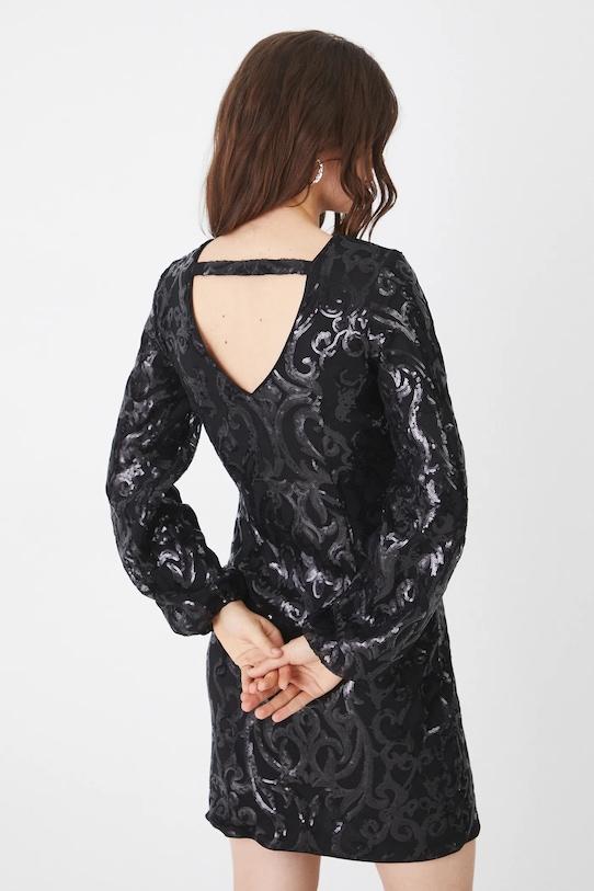 Платье из коллекции «Медицина». Приталенная модель из материала с пайетками. - Приталенный крой. - Длинные, пышные рукава. - Рукава отделаны резинкой. - Круглый вырез. - Декоративный вырез сзади. - Модель изготовлена из сетчатого материала. - Дополнительный слой материала в виде подкладки. - Модель выполнена из ткани с пайетками. - Модель мини-длины. - Длина рукава: 62 см. - Ширина груди: 42 см. - Ширина талии: 37 см. - Длина: 89 см. - Размеры указаны для размера: S.