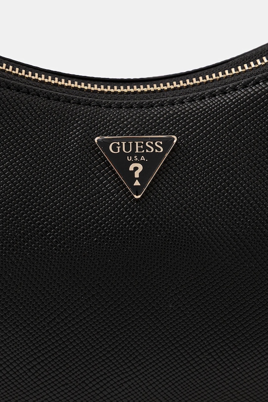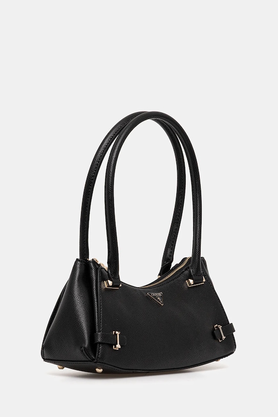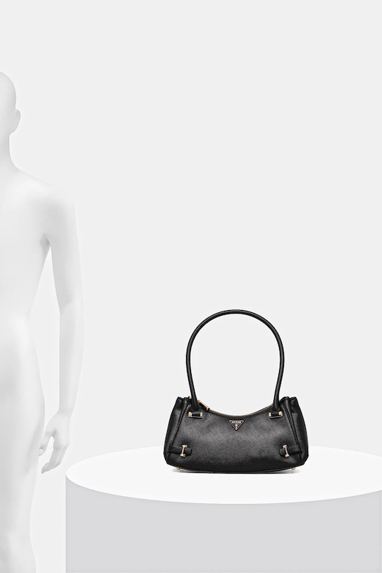 Небольшая сумочка из коллекции Guess. Модель на молнии, выполнена из экокожи. - Имеет три отделения. - Застежка-молния. - Внутренние отделения для карт. - Модель на подкладке. - Модель оснащена металлическими ножками, защищающими дно сумки. - Ручки для удобной переноски в руке или на плече. - Не подходит для формата А4. - Входящий в комплект тканевый чехол защищает изделие от пыли. - Глубина: 10 см. - Высота: 12,5 см. - Ширина у основания: 27,5 см. - Длина ручки: 56 см.