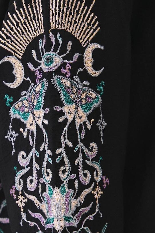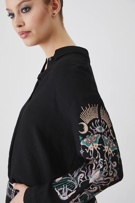 Рубашка из коллекции «Медицина». Изготовлена из ткани с декоративной вышивкой. С воротником. - Обычная посадка. - Длинный рукав. - Заниженная линия плеча. - Манжеты на пуговицах. - Модель с воротником. - Застежка на пуговицы. - Модель с декоративной вышивкой. - Узор с растительными и животными мотивами. - Более длинная спина. - Длина рукава (от воротника): 71 см. - Длина спереди: 69 см. - Длина спинки: 71 см. - Ширина груди: 54 см. - Размеры указаны для размера: S.