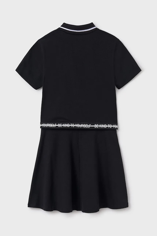Этот детский комплект из коллекции Mayoral выполнен из тонкой, эластичной ткани. Исключительно комфортный материал с высоким содержанием хлопка. – Инициатива «Лучший хлопок». Изделия с этой маркировкой содержат не менее 50% хлопка от розничного продавца или бренда, участвующего в инициативе «Лучший хлопок» и инвестирующего в развитие BCI. - В комплект входит: футболка и юбка. - Модель с воротником. - Застежка-молния. - Короткий рукав. - Высокая талия с эластичным поясом. - Расклешенная юбка.