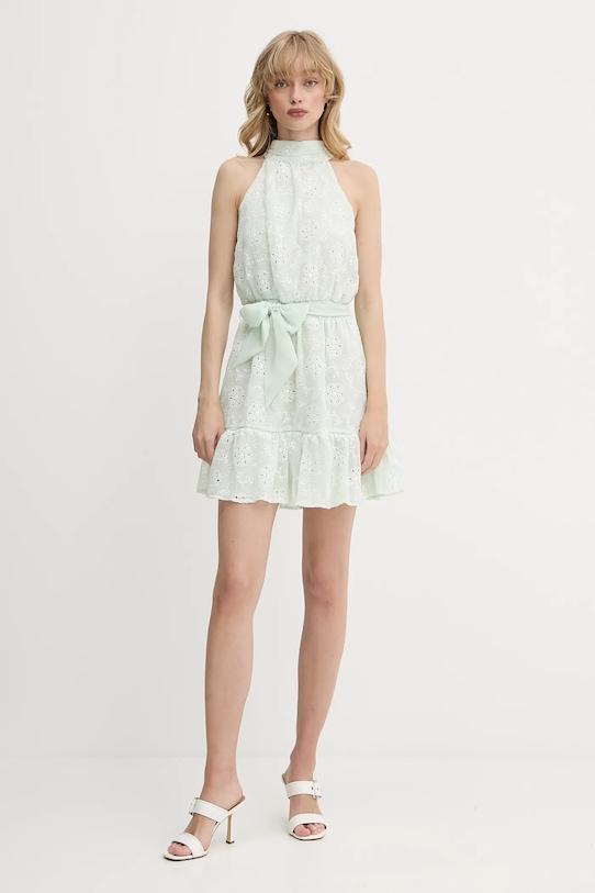 Это платье из коллекции Guess выполнено из ткани с рисунком. Полиэстер обеспечивает повышенную устойчивость к сминанию. - Содержит переработанный пластик. - Модель мини-длины. - Расклешенный крой. - Модель с водолазкой. - Открытые плечи. - Декоративный разрез сзади. - Декоративная шнуровка сзади. - Ремешок в комплекте. - Эластичный пояс. - Дополнительный слой материала в виде подкладки. - Длина: 90 см. - Ширина под мышками: 43 см. - Размеры указаны для размера: S.