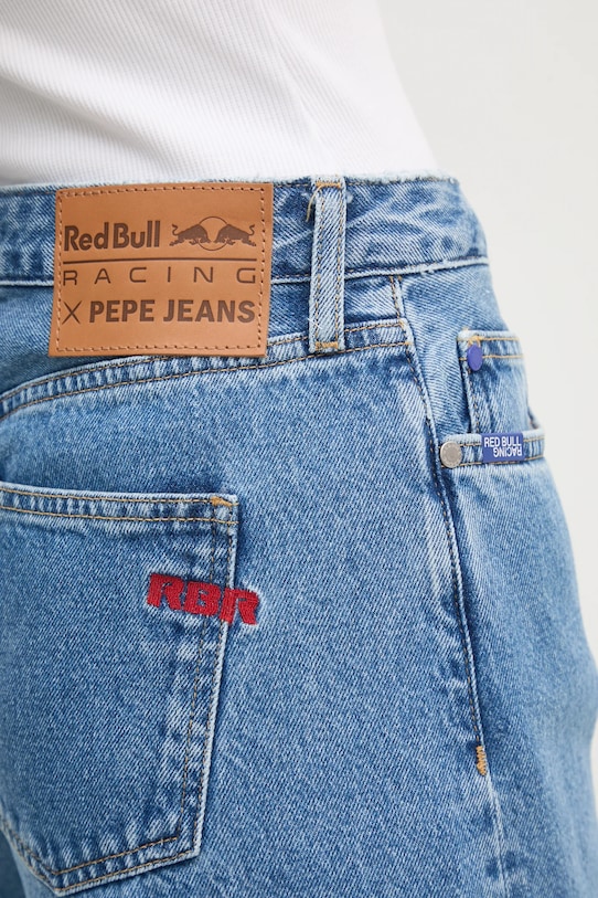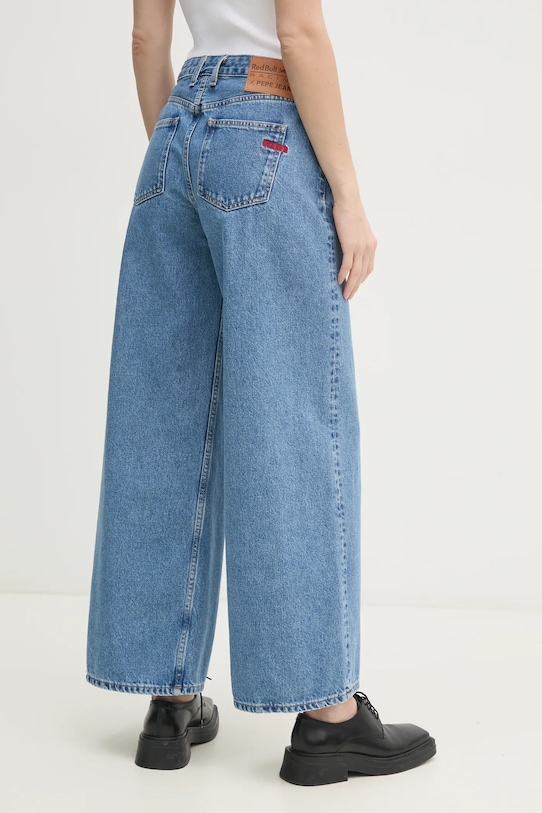 Эти джинсы широкого кроя из коллекции Red Bull Racing x Pepe Jeans имеют высокую посадку и выполнены из жесткого денима. - Модель с высокой талией, застежкой на пуговицы и молнию. - Три накладных кармана спереди. - Два накладных кармана на ягодицах. - Декоративно выстиранный деним. - Ширина талии: 36 см. - Ширина бедер: 50 см. - Высота талии: 26 см. - Ширина штанины внизу: 28 см. - Ширина штанины: 28 см. - Длина внешнего шва: 100 см. - Размеры указаны для размера: 27/30.