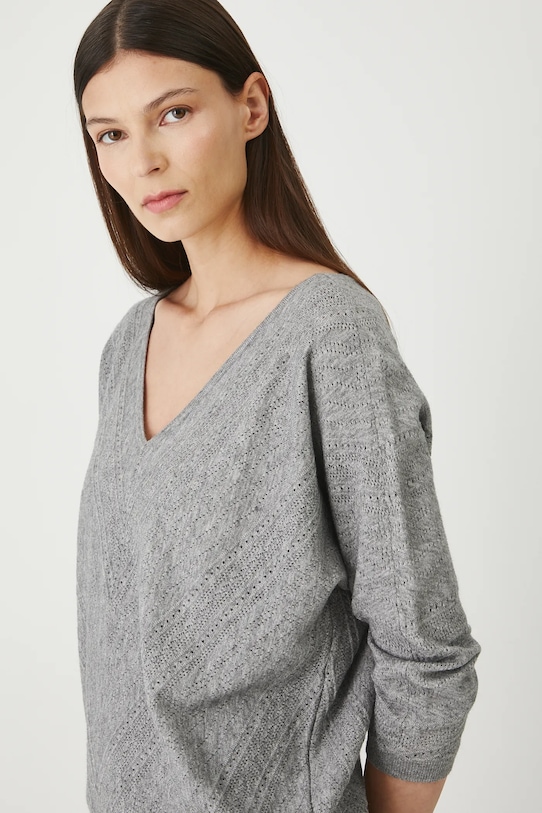 Свитер из коллекции Medicine. С острым вырезом и ажурным трикотажем. - Материал с сертификатом OEKO-TEX Standard 100 гарантирует, что текстильные изделия, на которых он нанесен, не содержат вредных и потенциально опасных для человека и окружающей среды веществ. - Обычная посадка. - Рукав три четверти. - Рукав кимоно. - Острый вырез. - Отделка ребер. - Модель выполнена из ажурного материала. - Длина рукава (от горловины): 51 см. - Длина: 60 см. - Размеры указаны для размера: S.