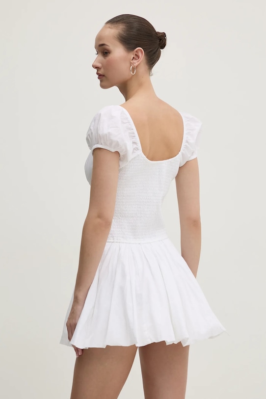 Это платье из коллекции Hollister Co. выполнено из гладкой ткани. Этот лёгкий материал идеально подходит для тёплого времени года. - Расклешенный крой. - Короткие рукава с буфами. - В зависимости от расположения рукавов его можно носить с испанским или круглым вырезом. - Модель с эластичной вставкой. - Два боковых накладных кармана. - Модель на подкладке, покрой комбинезона. - Длина: 73 см. - Ширина под мышками: 37 см. - Ширина талии: 34 см. - Размеры указаны для размера: S.