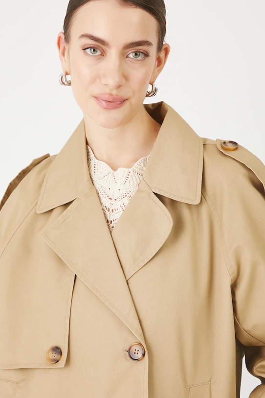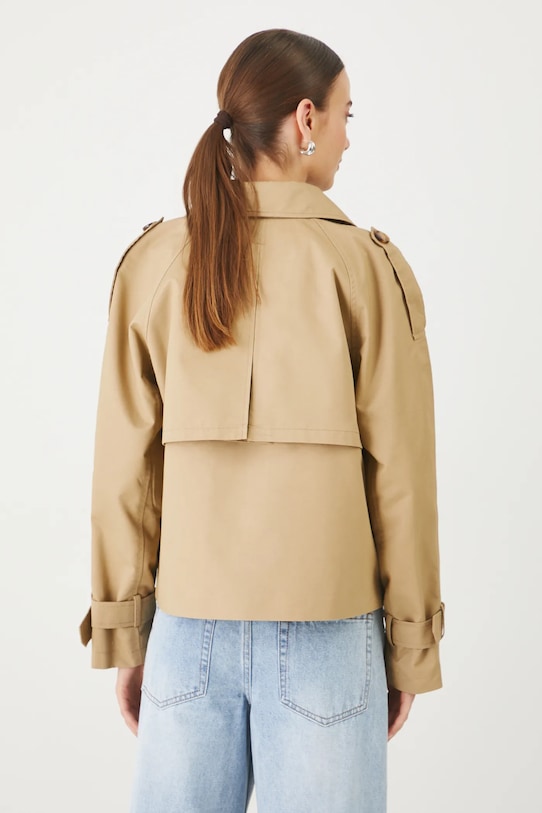 Короткий тренч из коллекции Medicine. Модель без подкладки, выполнена из гладкой ткани. - Большой размер. - Длинные рукава реглан. - Нижние края рукавов с регулируемой шириной. - Двубортный пиджак с застежкой на пуговицы. - Классические лацканы. - Погоны на плечах. - Два боковых накладных кармана. - Неутепленная модель с подкладкой. - Гладкий материал. - Длина рукава (от воротника): 73 см. - Длина: 59 см. - Ширина груди: 55,5 см. - Размеры указаны для размера: S.