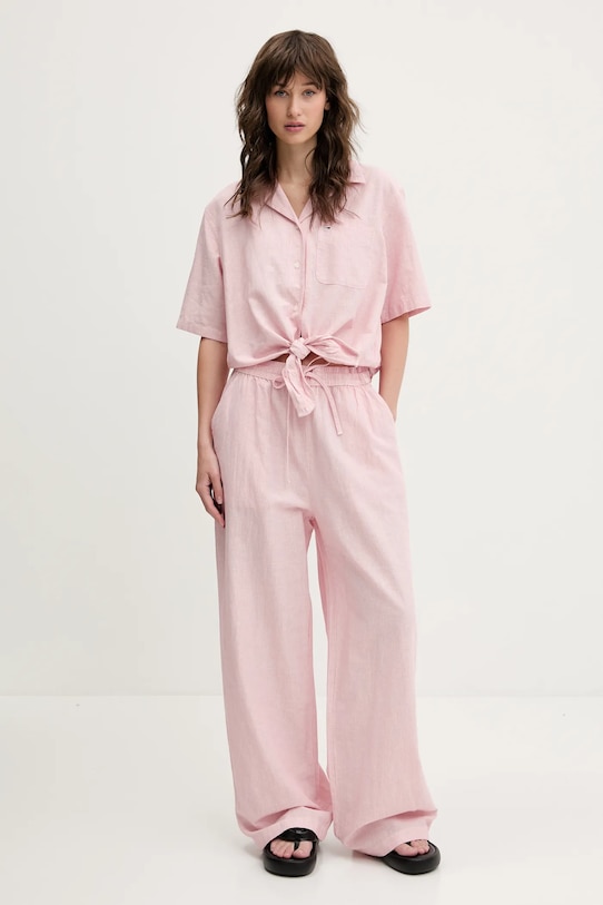 Брюки из коллекции Tommy Jeans из тонкой, неэластичной ткани. Модель выполнена из исключительно комфортного, дышащего материала. - Прямая нога полной длины. - Эластичный пояс со шнурками. - Завязки на талии. - Два накладных кармана спереди. - Два накладных кармана на ягодицах. - Ширина талии: 37 см. - Ширина бедер: 50 см. - Высота талии: 33 см. - Ширина штанины внизу: 28 см. - Ширина штанины: 30 см. - Длина по внутреннему шву: 77 см. - Размеры указаны для размера: S.