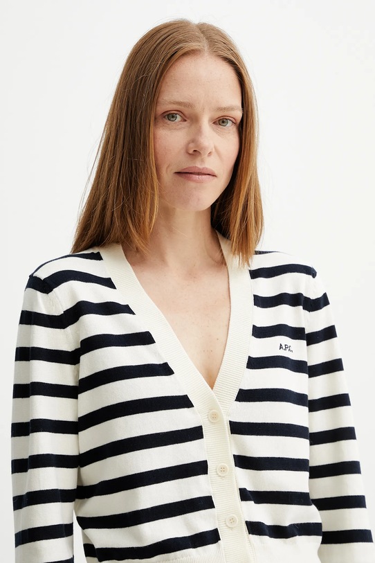 Кардиган из коллекции APC Изготовлен из хлопчатобумажного трикотажа. - Удобная застежка на кнопки позволяет легко надевать и снимать. - Этот свитер прямого кроя обеспечивает комфорт и универсальный вид. Он мягко облегает фигуру, не перетягивая её. Классический и простой, он прекрасно сочетается как с элегантными, так и с повседневными образами. - Рукава и нижний край отделаны удобными эластичными манжетами. - Длина: 50 см. - Ширина под мышками: 45 см. - Размеры указаны для размера: S.