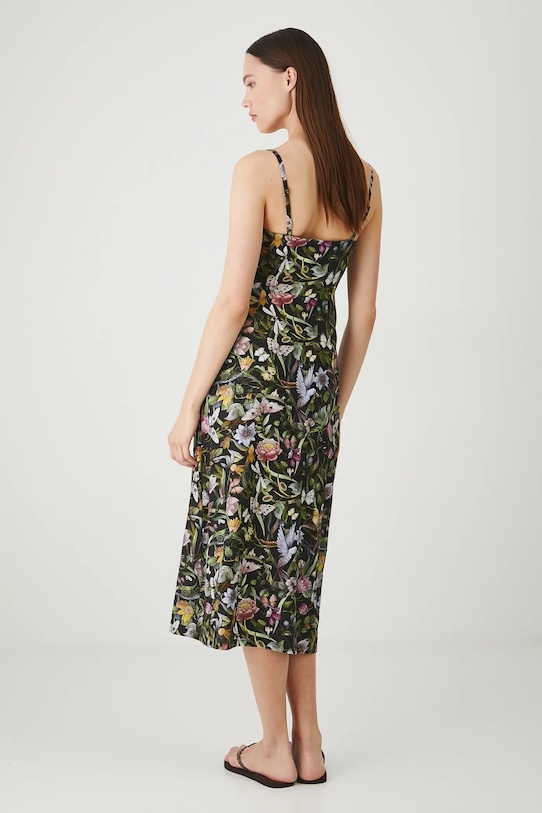 Платье из коллекции «Медицина». Простой крой, выполнено из смеси льна и вискозы. - Льняной материал обеспечивает комфорт и воздухопроницаемость. - Простой дизайн. - Модель без бретелек. - Регулируемые, несъемные лямки. - Острый вырез. - Застежка на пуговицы. - Застежка-молния. - Узорчатая ткань. - Узор с растительными и животными мотивами. - Модель длины миди. - Ширина талии: 38 см. - Ширина груди: 44,5 см. - Длина: 115 см. - Размеры указаны для размера: S.