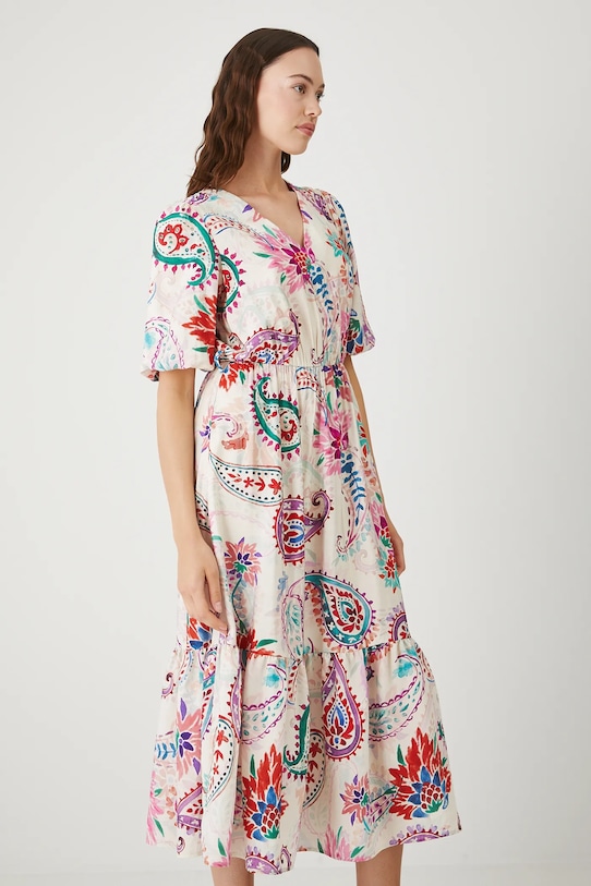 Платье из коллекции «Медицина». Расклешенный фасон из узорчатой ткани. - Расклешенный крой. - Рукав три четверти. - У него пышные рукава. - Острый вырез. - Эластичный пояс. - Текстильный ремешок в комплекте. - Модель с декоративной оборкой. - Узорчатая ткань. - Узор пейсли. - Модель длины миди. - Ширина талии (до растягивания): 33,5 см. - Ширина талии (после растяжения): 48 см. - Ширина груди: 50,5 см. - Длина: 129 см. - Размеры указаны для размера: S.