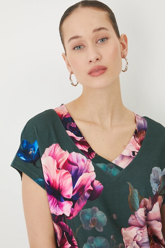 Футболка из коллекции «Медицина». Изготовлена из трикотажного полотна с принтом. - Материал с сертификатом OEKO-TEX Standard 100 гарантирует, что текстильные изделия, на которых он нанесен, не содержат вредных и потенциально опасных для человека и окружающей среды веществ. - Обычная посадка. - Короткие рукава кимоно. - Декоративный, заостренный вырез. - Модель с принтом. - Печать с растительным мотивом. - Длина: 62 см. - Ширина груди: 55 см. - Размеры указаны для размера: S.