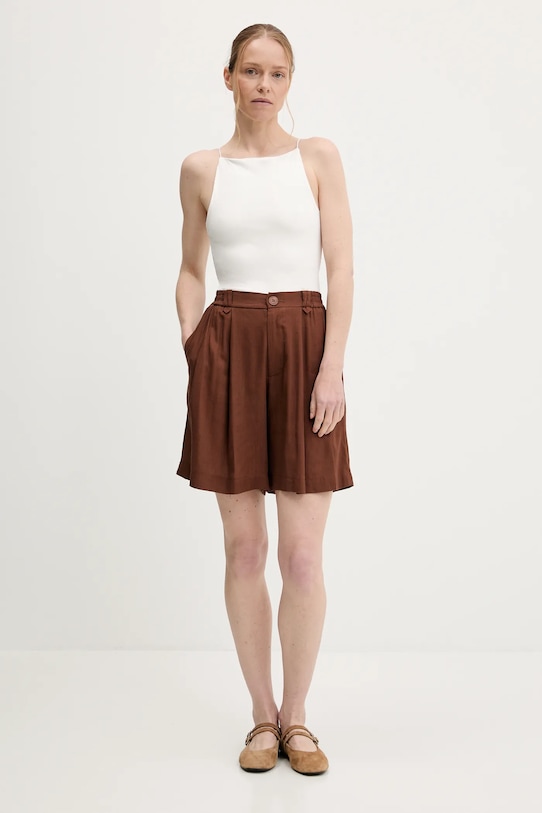 Шорты из коллекции Answear.LAB, выполненные из тонкой, неэластичной ткани. Модель выполнена из дышащего материала с высоким содержанием вискозы. - Модель с высокой талией, застежкой на пуговицы и молнию. - Два боковых накладных кармана. - Имитация карманов на ягодицах. - Материал с декоративными складками. - Ширина талии: 32 см. - Ширина бедер: 55 см. - Высота талии: 31 см. - Ширина штанины по низу: 39 см. - Длина внешней части штанины: 47 см. - Указаны размеры: S/M.