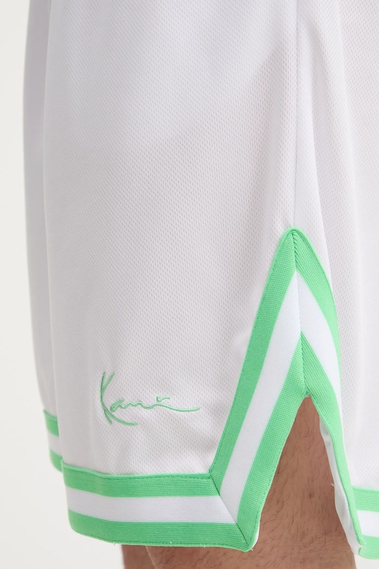 Шорты из коллекции Karl Kani из трикотажного полотна. Полиэстер обеспечивает повышенную устойчивость к сминанию. - Простой дизайн, не стесняющий движений. - Талию можно регулировать изнутри и снаружи с помощью шнурков. - Накладные карманы. - Тонкий, эластичный трикотаж. - Ширина талии: 37 см. - Ширина бедер: 65 см. - Высота талии: 34 см. - Ширина штанины внизу: 37 см. - Ширина штанины: 40 см. - Длина внешней части штанины: 54 см. - Размеры указаны для размера: M.