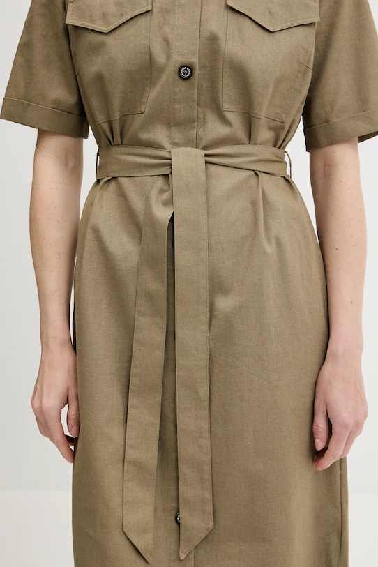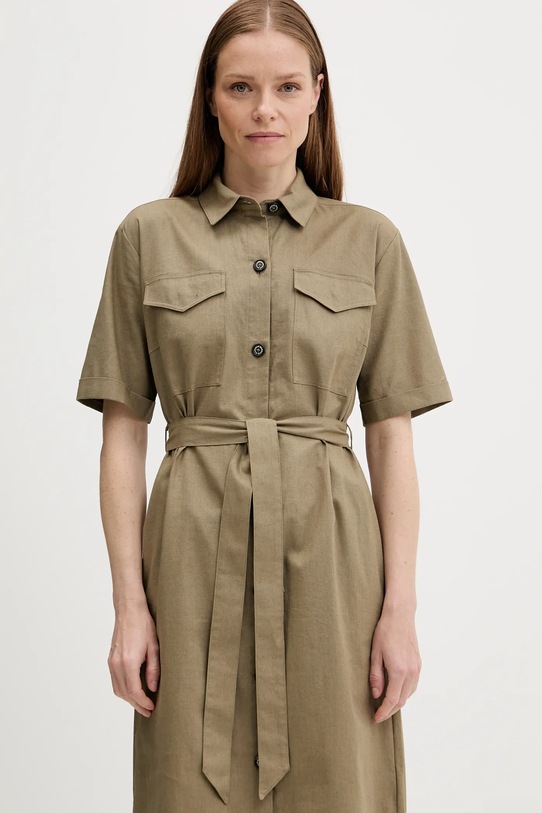 Это платье из коллекции Barbour выполнено из тонкой, неэластичной ткани. Модель выполнена из воздушного, дышащего материала с добавлением льна. - Модель длины миди. - Простой дизайн. - Короткий рукав. - Модель с воротником. - Застежка на пуговицы. - Два боковых накладных кармана. - Два нагрудных кармана с застежкой на кнопку. - Текстильный ремешок в комплекте. - Модель без подкладки. - Длина: 124 см. - Ширина под мышками: 47 см. - Размеры указаны для размера: 36.