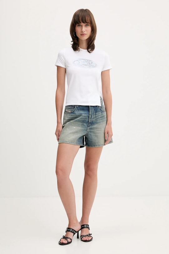 Шорты из коллекции Diesel, выполненные из стираного денима. Изготовлены из дышащей хлопковой ткани. - Простой дизайн, не стесняющий движений. - Модель с высокой талией и застежкой на пуговицы. - Накладные карманы. - Материал с декоративными потертостями. - Тонкая, неэластичная ткань. - Ширина талии: 36 см. - Ширина бедер: 52 см. - Высота талии: 30 см. - Ширина штанины внизу: 31 см. - Ширина штанины: 33 см. - Длина: 36,5 см. - Размеры указаны для размера: 27.
