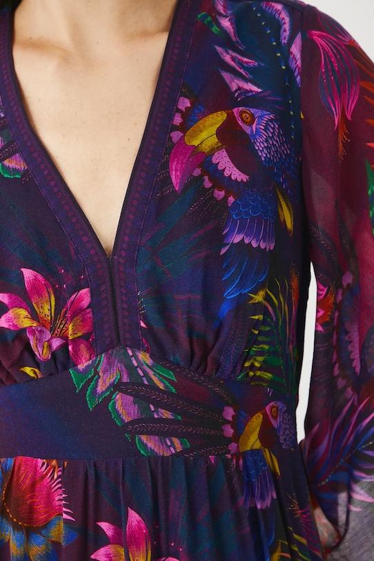 Платье из коллекции «Медицина». Расклешенный фасон из узорчатой ткани. - Расклешенный крой. - Рукав три четверти. - Острый вырез. - Эластичная резинка сзади. - Декоративные оборки. - Модель с декоративной оборкой. - Узорчатая ткань. - Узор с растительными и животными мотивами. - Модель макси длины. - Ширина талии (до растягивания): 35,5 см. - Ширина талии (после растяжения): 46 см. - Ширина груди: 48 см. - Длина: 134 см. - Размеры указаны для размера: S.