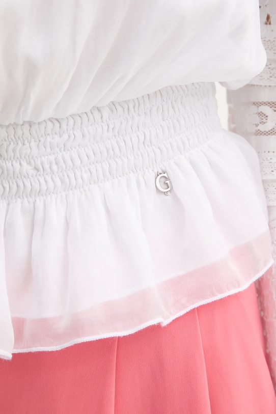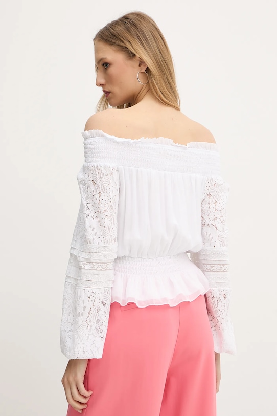 Эта блузка Guess выполнена из тонкой, неэластичной ткани. Модель выполнена из исключительно комфортного материала с высоким содержанием вискозы. - Простой дизайн, не стесняющий движений. - Испанский вырез. - Длинный рукав. - Эластичный пояс для индивидуальной посадки. - Рукава отделаны удобными эластичными манжетами. - Дополнительный слой материала в виде подкладки. - Кружевные вставки. - Длина: 48 см. - Ширина под мышками: 46 см. - Размеры указаны для размера: S.