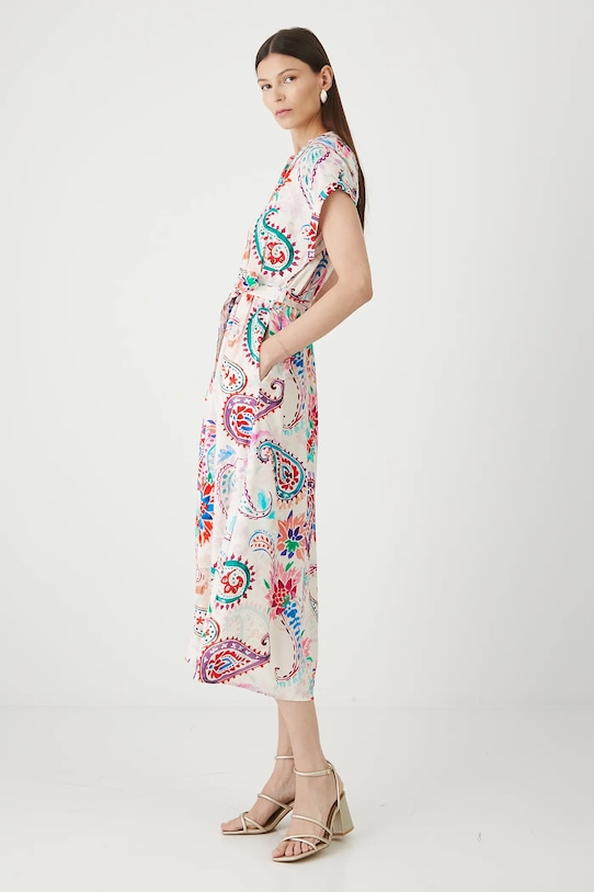 Платье из коллекции «Медицина». Расклешенный фасон из узорчатой ткани. - Расклешенный крой. - Короткие рукава кимоно. - Острый вырез с воротником. - Застежка на пуговицы. - Эластичный пояс. - Текстильный ремешок в комплекте. - Модель с накладными карманами. - Узорчатая ткань. - Модель длины миди. - Ширина талии (до растягивания): 34 см. - Ширина талии (после растяжения): 43 см. - Ширина груди: 52 см. - Длина: 129 см. - Размеры указаны для размера: S.