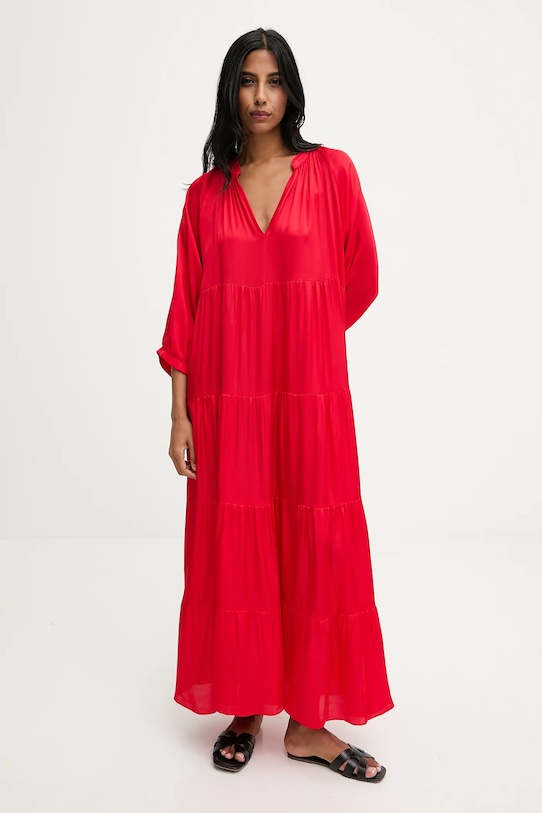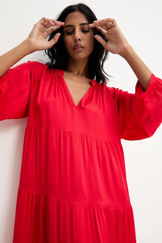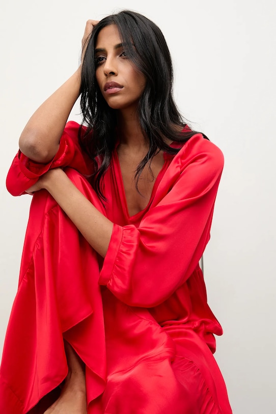 Это платье из коллекции Answear.LAB выполнено из гладкой атласной ткани. Модель выполнена из дышащего вискозного материала. - Расклешенный крой. - Декоративный, заостренный вырез. - Модель с воротником-стойкой. - Рукава реглан благодаря своей конструкции обеспечивают большую свободу движений. - Модель с декоративными оборками. - Тонкая, неэластичная ткань. - Длина рукава (от воротника): 60 см. - Длина: 136 см. - Ширина под мышками: 50 см. - Указаны размеры: S/M.