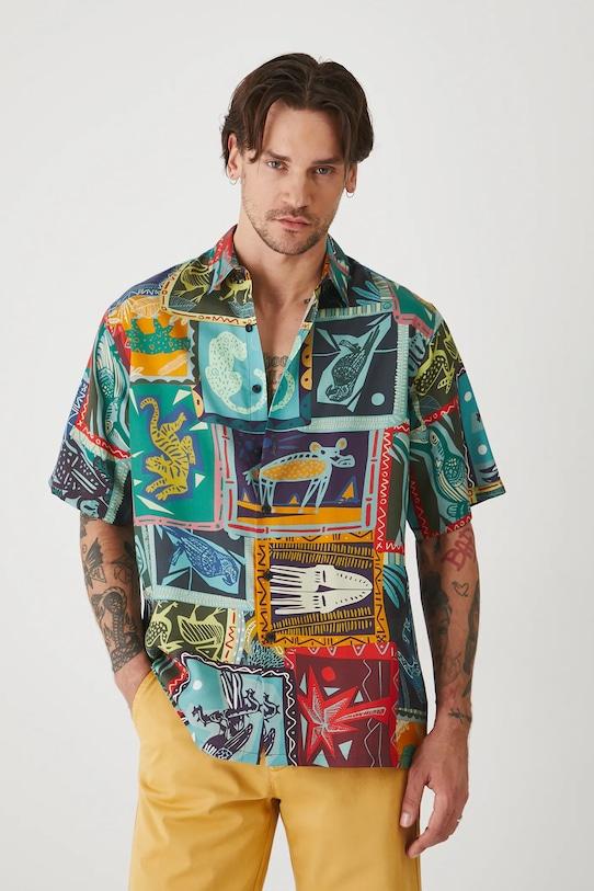 Эта рубашка из коллекции Medicine выполнена из узорчатой ткани и имеет классический жесткий воротник. - Рубашка свободного кроя отличается свободным кроем, обеспечивает комфорт и не стесняет движений. - Короткий рукав. - Классический жесткий воротник «Кент». - Застежка на пуговицы. - Узорчатая ткань. - Модель изготовлена из лиоцелла. - Окружность воротника: 43,5 см. - Длина: 78 см. - Ширина груди: 62 см. - Ширина плеч: 50,2 см. - Размеры указаны для размера: L.