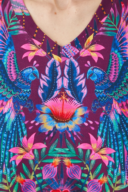 Футболка из коллекции «Медицина». Изготовлена из ткани с рисунком. - Материал с сертификатом OEKO-TEX Standard 100 гарантирует, что текстильные изделия, на которых он нанесен, не содержат вредных и потенциально опасных для человека и окружающей среды веществ. - Большой размер. - Короткие рукава кимоно. - Острый вырез. - Узорчатое трикотажное полотно. - Узор с растительными и животными мотивами. - Длина: 63 см. - Ширина груди: 58 см. - Размеры указаны для размера: S.
