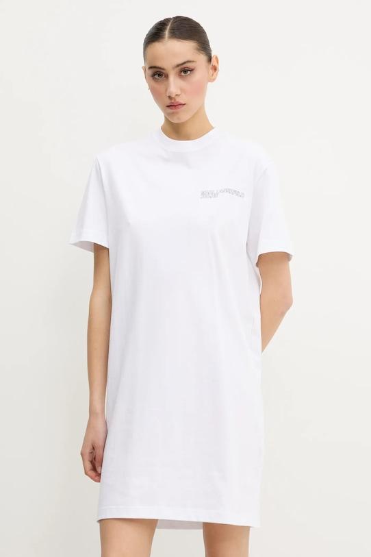 Это платье из коллекции Karl Lagerfeld Jeans выполнено из тонкой, слегка тянущейся ткани. Модель выполнена из исключительно комфортного хлопкового материала. - Модели линейки Karl Cares изготовлены из материалов, произведенных в ходе устойчивого, экологически чистого процесса производства. - Свободный крой, обеспечивающий полную свободу движений. - Модель с принтом. - Классический круглый вырез. - Длина: 90 см. - Ширина под мышками: 49 см. - Размеры указаны для размера: S.