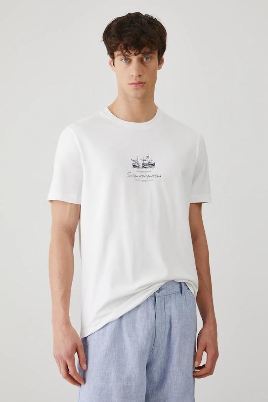 Футболка из коллекции «Medicine». Изготовлена из трикотажного полотна с принтом. - Материал с сертификатом OEKO-TEX Standard 100 гарантирует, что текстильные изделия, на которых он нанесен, не содержат вредных и потенциально опасных для человека и окружающей среды веществ. - Приталенный крой. - Короткий рукав. - Круглый вырез. - Модель с принтом. - Печать с надписью: Sea You в яхт-клубе. - Длина: 74,5 см. - Ширина груди: 54 см. - Размеры указаны для размера: L.