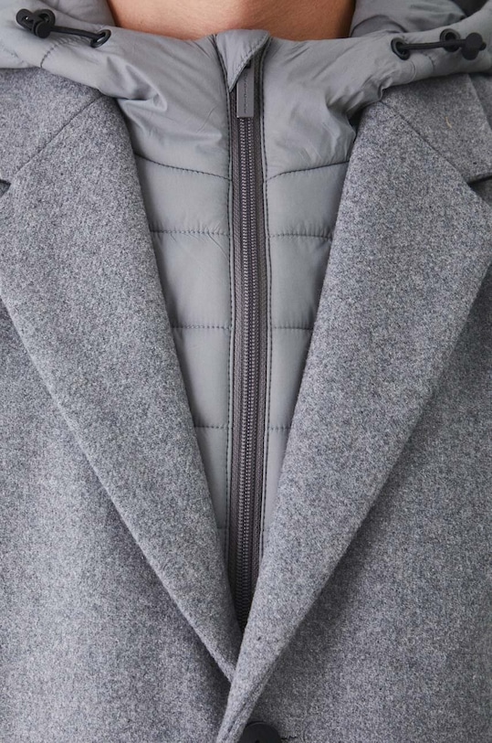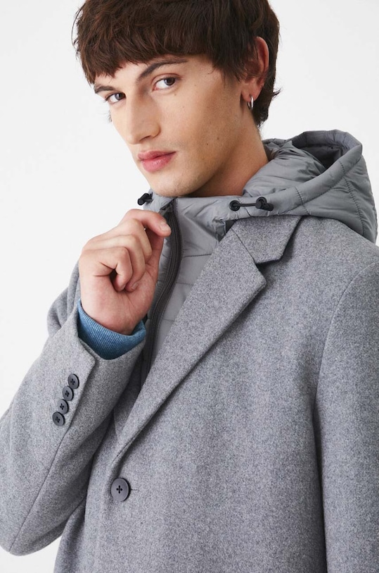 Пальто из коллекции «Медицина». Утеплённая модель выполнена из смесовой шерсти. - Простой дизайн. - Модель со съемной стеганой подкладкой. - Съемный капюшон со шнурками. - Однобортный пиджак с застежкой на пуговицы. - Два боковых накладных кармана. - Разрез сзади. - Меланжевый трикотаж. - Утепленная модель с подкладкой. - Длина рукава: 67 см. - Длина: 102 см. - Ширина под мышками: 59 см. - Ширина плеч: 47,5 см. - Размеры указаны для размера: L.