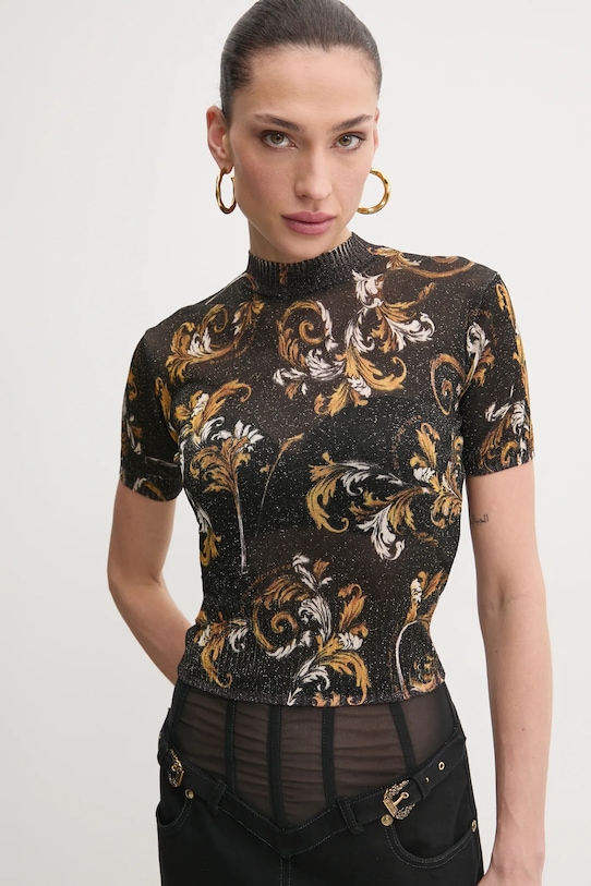 Этот свитер из коллекции Versace Jeans Couture выполнен из тонкого трикотажа. Он изготовлен из исключительно комфортного материала с высоким содержанием вискозы. - Приталенный крой, не стесняющий движений. - Модель с водолазкой. - Короткий рукав. - Рукава и нижний край отделаны удобными эластичными манжетами. - Плетение с декоративной металлической нитью. - Эластичный трикотаж. - Длина: 52,5 см. - Ширина под мышками: 43 см. - Размеры указаны для размера: S.